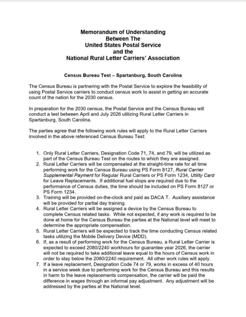 In preparation for the 2030 census, the Postal Service and the Census Bureau will conduct a test between April and July 2026 utilizing Rural Letter Carriers in Spartanburg, South Carolina.