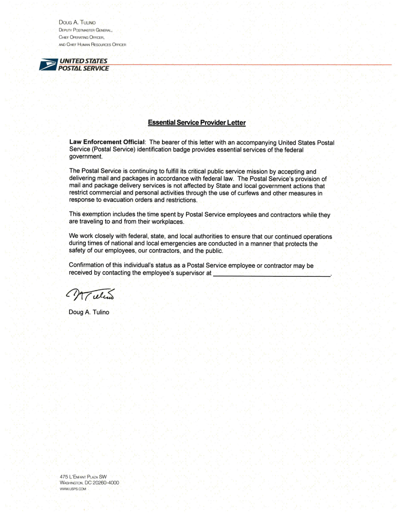 In January 2026, social media posts circulated an image of a letter allegedly sent to U.S. Postal Service workers. The letter stated it could serve as proof that the postal worker was classified as an essential employee, exempting them from certain state or local government restrictions, such as curfews and some evacuation orders.