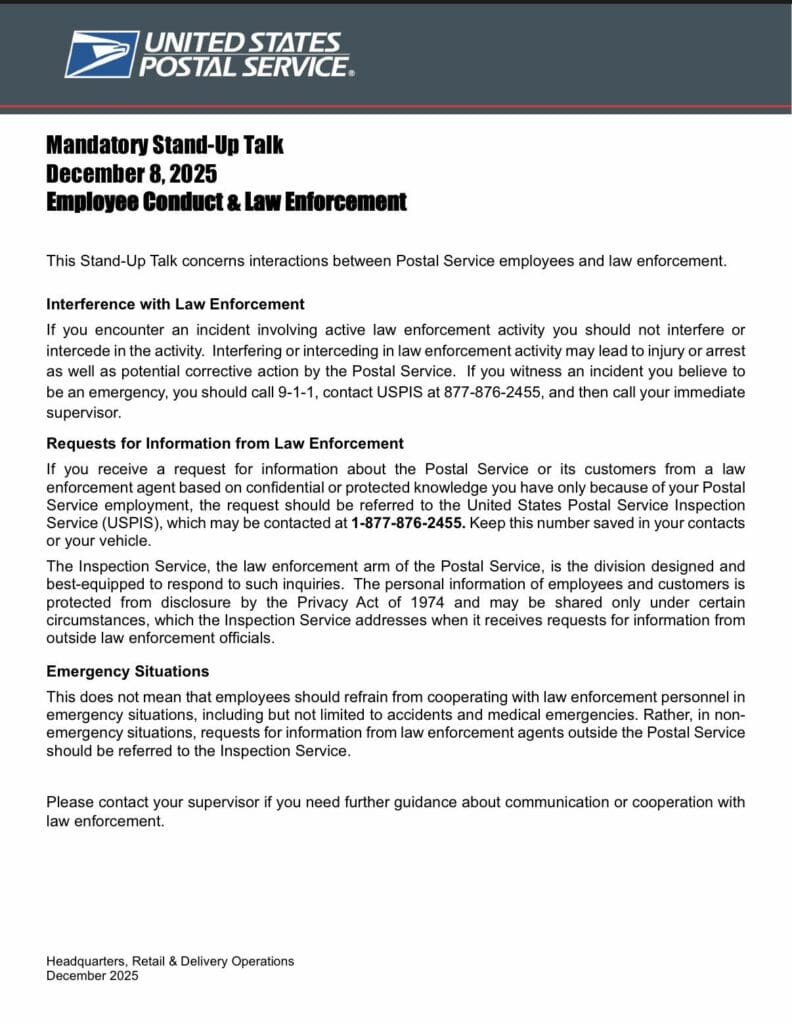 If you encounter an incident involving active law enforcement activity you should not interfere or intercede in the activity. Interfering or interceding in law enforcement activity may lead to injury or arrest as well as potential corrective action by the Postal Service. If you witness an incident you believe to be an emergency, you should call 9-1-1, contact USPIS at 877-876-2455, and then call your immediate supervisor.